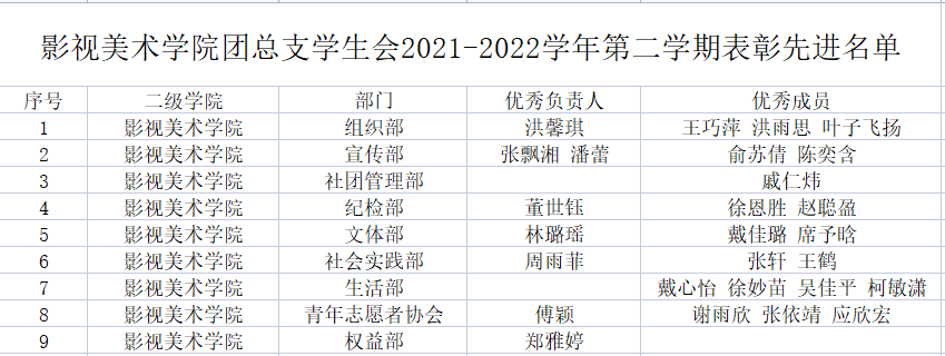 根据影视美术学院团总支、学生会评优标准,经个人申报,部门负责人考察推荐,团总支综合考评,拟评选优秀部门负责人8名、优秀成员19名,现予以公示。