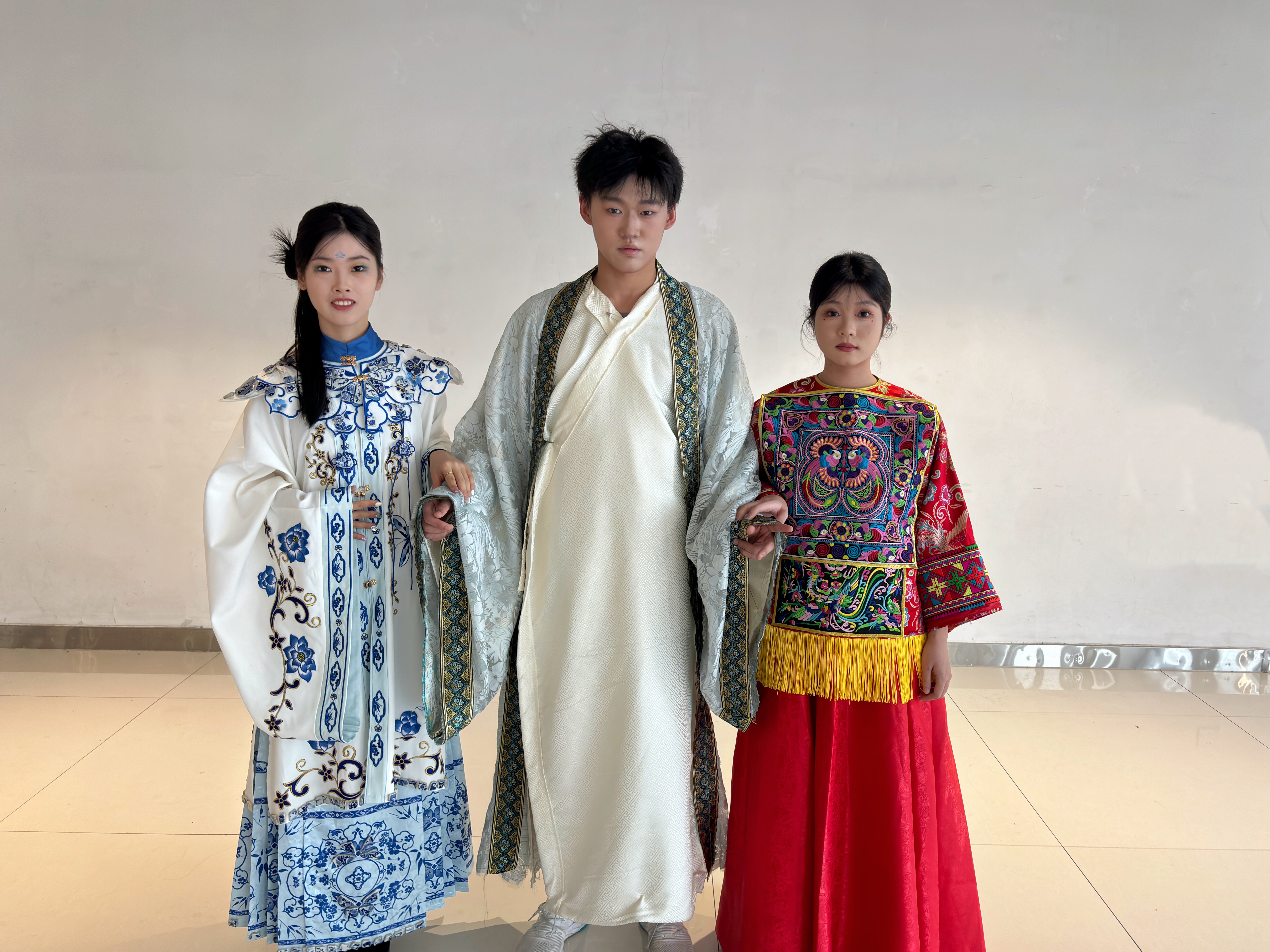 “白蛇缘起,情牵西湖”则借助白蛇传说的浪漫元素,在服装设计上,整体采用青白配色,契合西湖与白蛇传的经典形象;妆面则融入了蛇麟状花纹,增添了几分神秘与独特。所有服装与妆容均由本院学生亲手设计制作,展示学院在人物形象设计与服饰设计方面的教学成果。