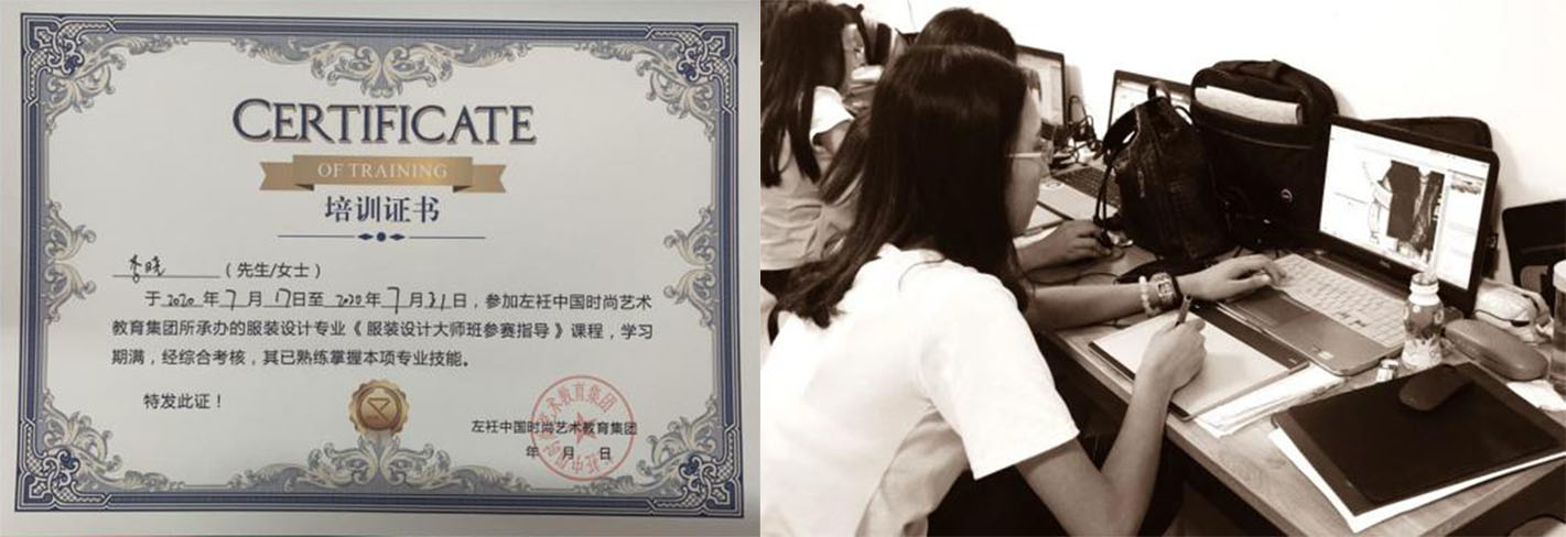 为进一步提升教学水平,2020年7月18号至2020年7月31号于左衽中国时尚艺术教育集团进行《服装设计大师班》课程培训,旨在通过培训提升自己的专业技能与教学水平,以更加专业的状态进行课程教学。
