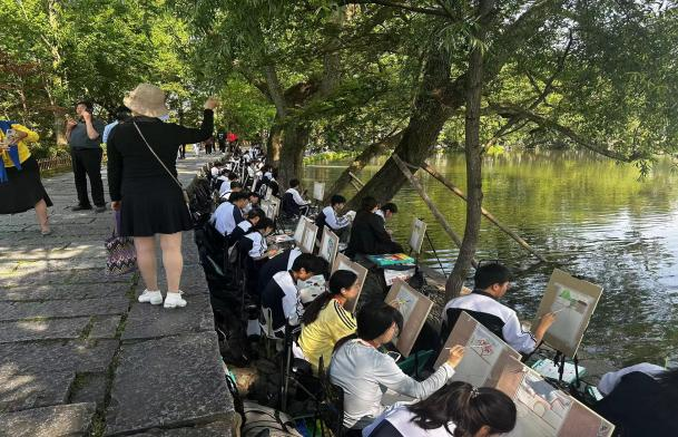 5月7日师生前往宏村艺术写生,宏村则以其独特的徽派建筑风格和秀美的自然风光吸引着无数游客。大学生们在宏村的青砖灰瓦、曲径通幽之间,纷纷拿出画笔,记录下这一片静谧和美丽。学生感受到了宏村独特的人文魅力和自然景色,激发了学生对于艺术的热情和灵感。